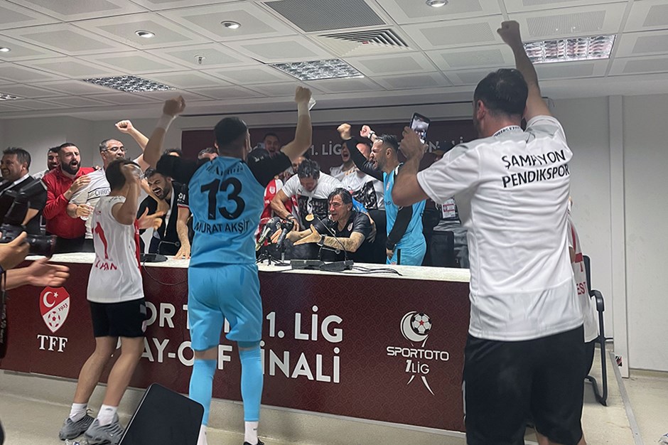 İLİŞKİLİ HABERLERİşte Süper Lig’e çıkan son takımMaçtan sonra katıldığı basın toplantısında, Pendikspor tarihine altın bir sayfa daha açıldığını kaydeden Özköylü, sözlerini şöyle sürdürdü:”Geçen sene bu zamanlar ikinci ligden birinci lige yükselmenin mutluluğunu yaşarken, bugün aynı mutluluğu Süper Lig’e çıkarak yaşadık. Gerçekten çok önemli maçlar. Yani bu başarı nasıl oldu, nasıl geldi, 2 senede bu takım, buraya nasıl çıktı, bu başarı nasıl elde edildi? Bunun hakikaten anlatmak lazım. Örneklendirmek lazım. Türkiye’de bu tür örneklere çok ihtiyaç olduğunu düşünüyorum. Türk futbolunun ekonomik anlamda kaosa gittiği dönemlerde böyle yatırımcıların kulüpleri alarak doğru bir şekilde doğru planlamalarla takımlarını başarıya ulaştırması hem Türk futboluna büyük katkı oluyor. Hem bu işin içindeki emekçiler olarak bizler adına büyük bir şans oluyor. Çünkü her istediğimizin elimizin altında olduğu imkanlarımızın 4 kat olduğu bir kulüpte çalışma imkanı bulduk.”Özköylü, Pendik Belediye Başkanı Ahmet Cin, kulüp başkanı Mahmut Türkoğlu ve ekibine teşekkür ederek, şunları kaydetti:”Onlar bize çok büyük bir imkan sundular. Biz oyuncularımızla beraber bize verilen imkanları en iyi şekilde kullanarak bu takımı bugün Süper Lig’e çıkarmanın mutluluğunu yaşıyoruz. Çok mutluyum, gururluyum. İki senede Süper Lig’e çıkan çok fazla takım olduğunu düşünmüyorum. Futbol tarihinde böyle bir başarıyı elde etmek de bizim adımıza ayrıca bir gurur. Bunun için oyuncularıma gerçekten çok teşekkür ediyorum. “Toplantı sonunda basın toplantı odasına gelen Pendiksporlu futbolcular, Osman Özköylü’yü ıslatarak, Süper Lig’e çıkmanın coşkusunu burada sürdürdü.